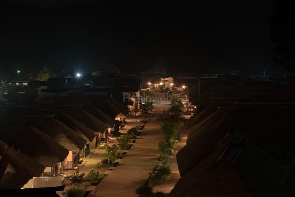 高台から見下ろすと、山々に囲まれた宿場町が暖かな灯りの中に静かに佇んでいました。