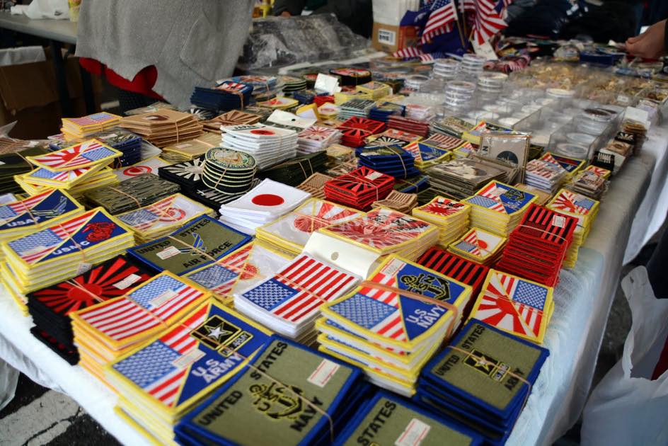 ですが、基地のお店では軍の払い下げ品を販売しているようなお店はなく、全てが新品です。プリントTシャツやカバン類が多くこのようなワッペンやポーチを買っていくお客さんを多くみかけました。