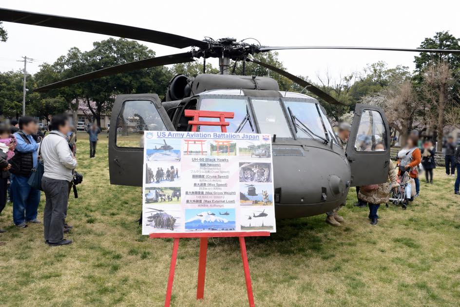 - 中央広場には実物のヘリコプターが展示され、米軍隊員と一緒に写真撮影ができる